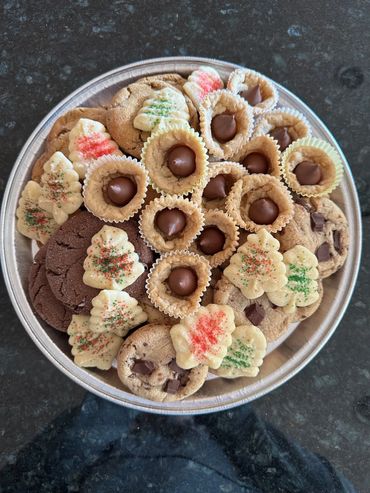 Cookie Platter: 3 dozen total cookies, includes Strawberry Iced Oatmeal Cookies, The Browniest Cookies, Soft & Chewy Sugar Cookies, and Mini Chocolate Chip Cookies. Wrapped in a beautiful platter for enjoying over the holidays or for giving as a party present. $72.00